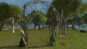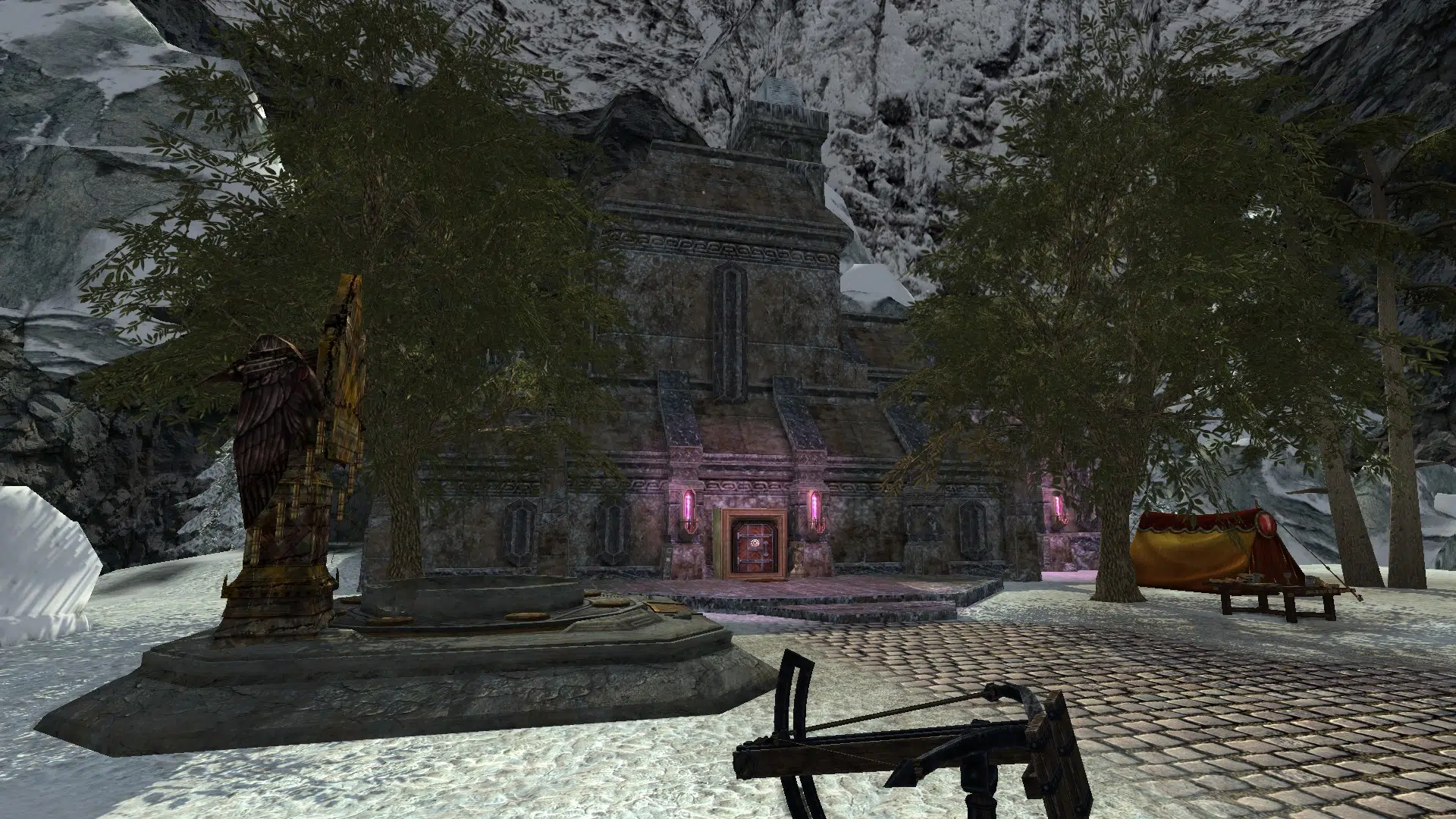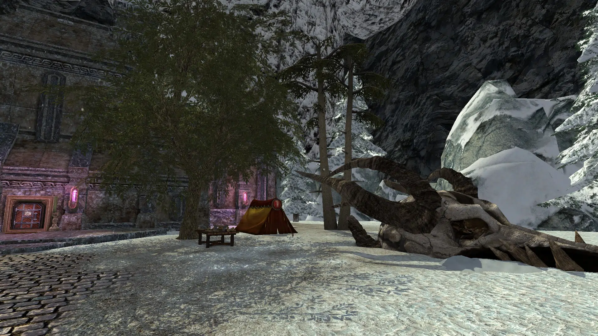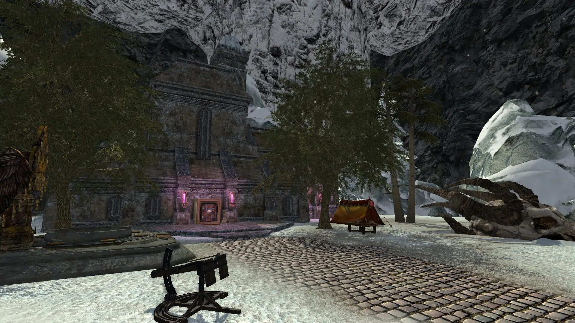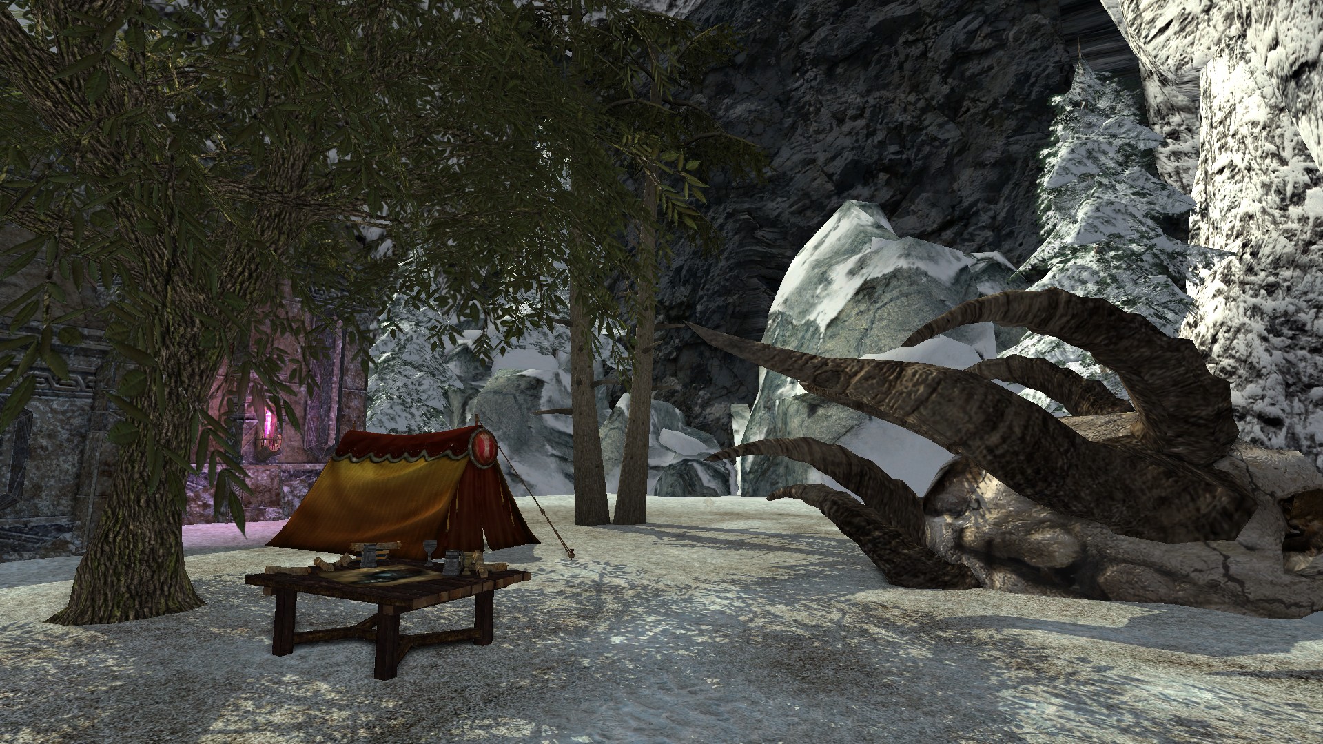 As an homage to the kinship’s Ered Mithrin origins, the yard recreates the scene of a dragon excavation site. A raven statue keeps watch over the camp and silently takes note of those who enter and leave the house through the side door.