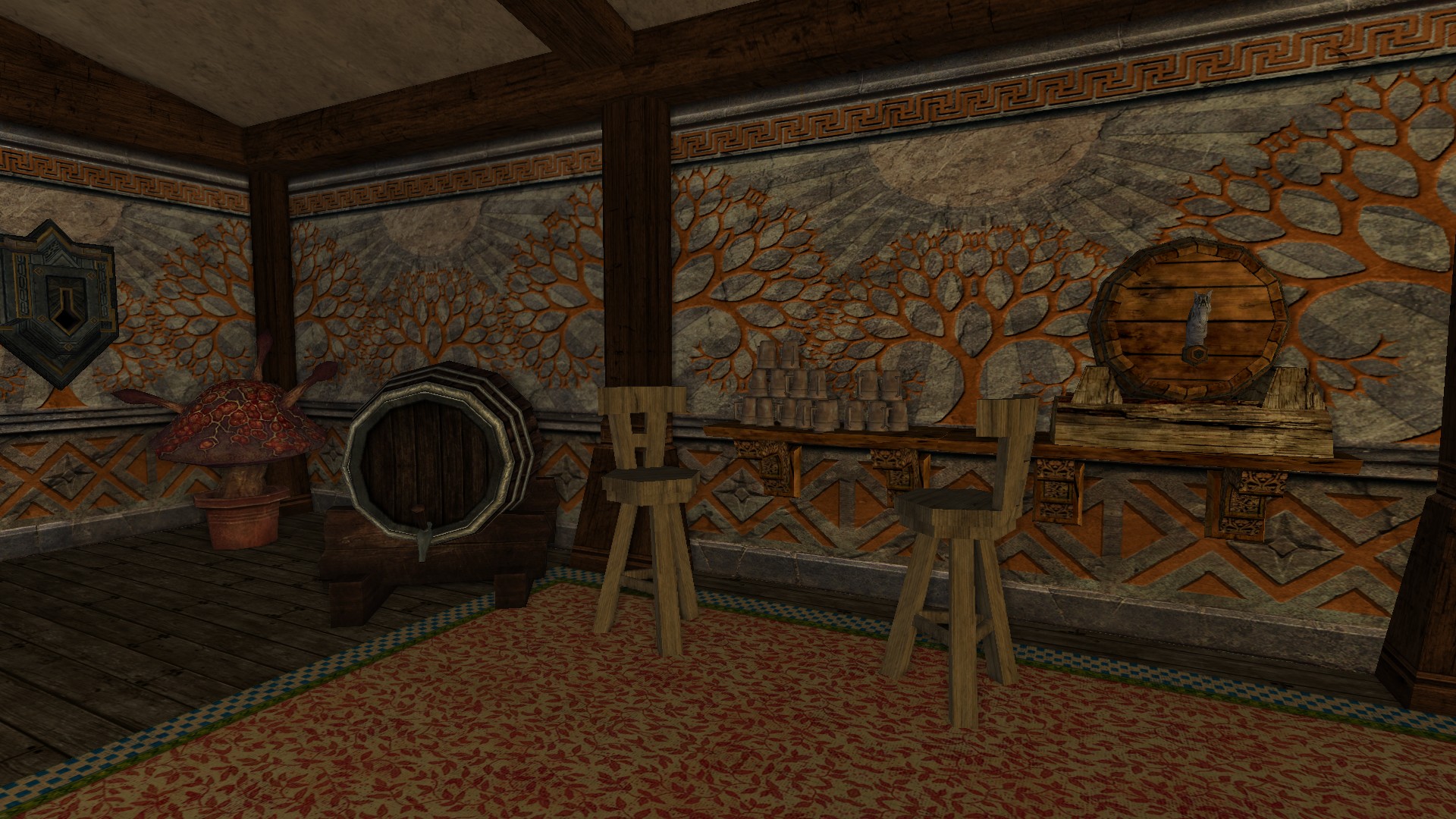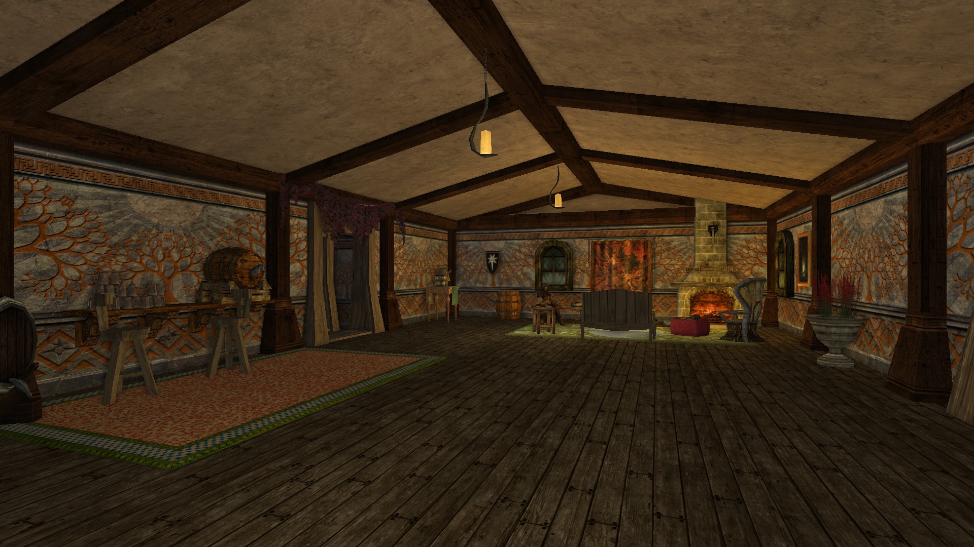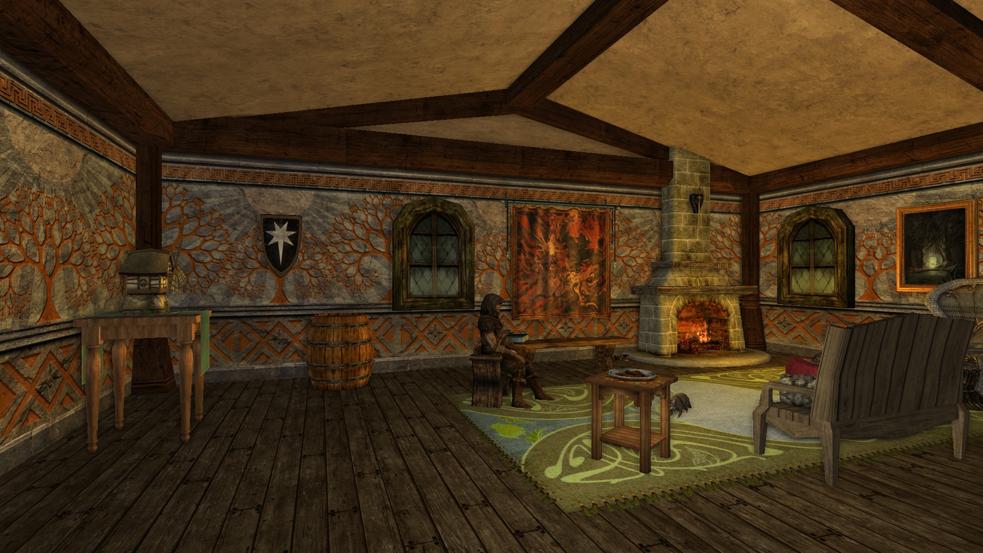 Please make yourself at home. Grab a mug of ale, fill a plate in the kitchen, and pull up a chair to the fireplace for warmth and good conversation. The ranger may seem reticent at first (some have uncharitably described his personality as "wooden"), but after a few mugs of ale you'll find him to be a marvelous listener. After a few more mugs of ale, he can be quite the storyteller--carrying on and on about a place called Erebor and the Arid Myth-something. We imagine the latter locale is quite dry.