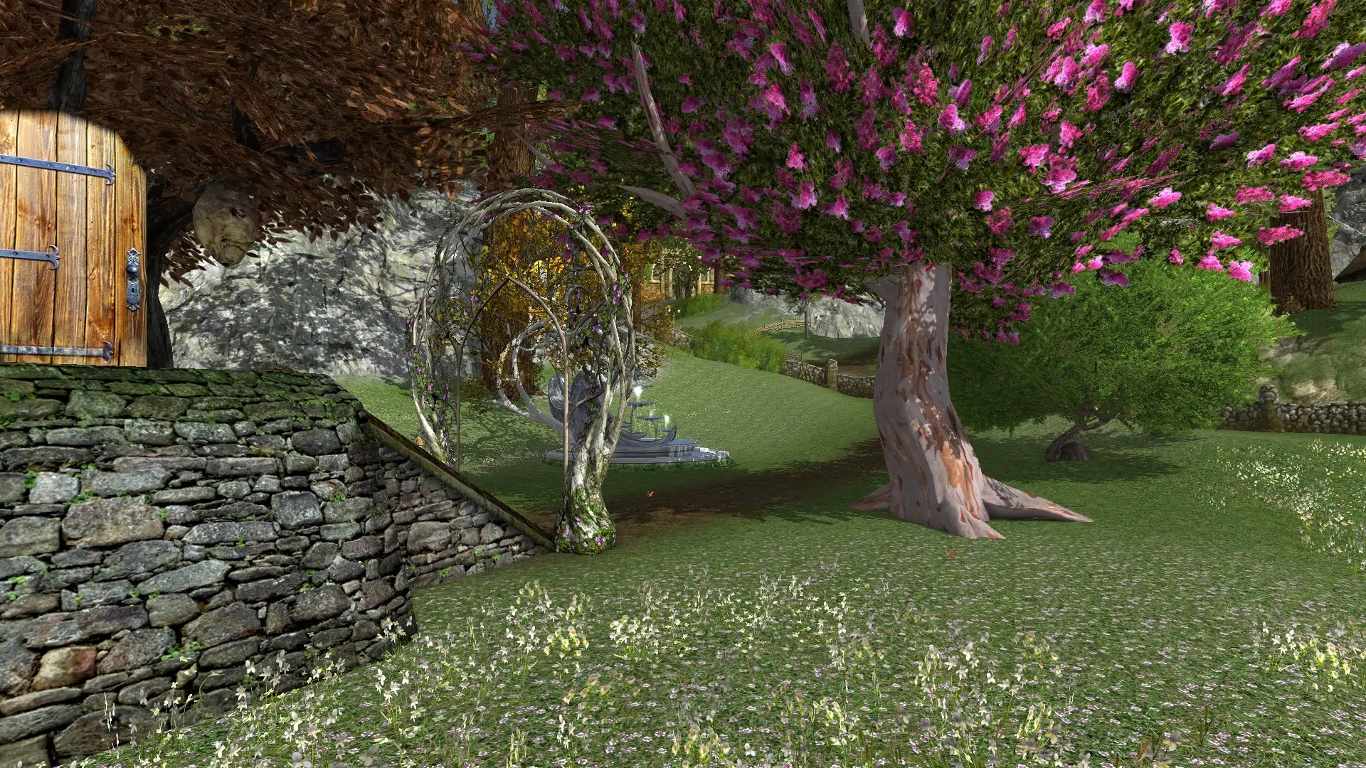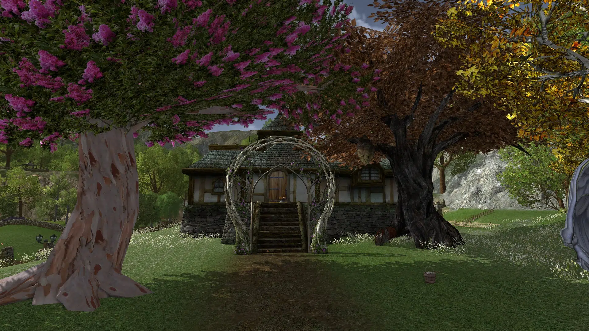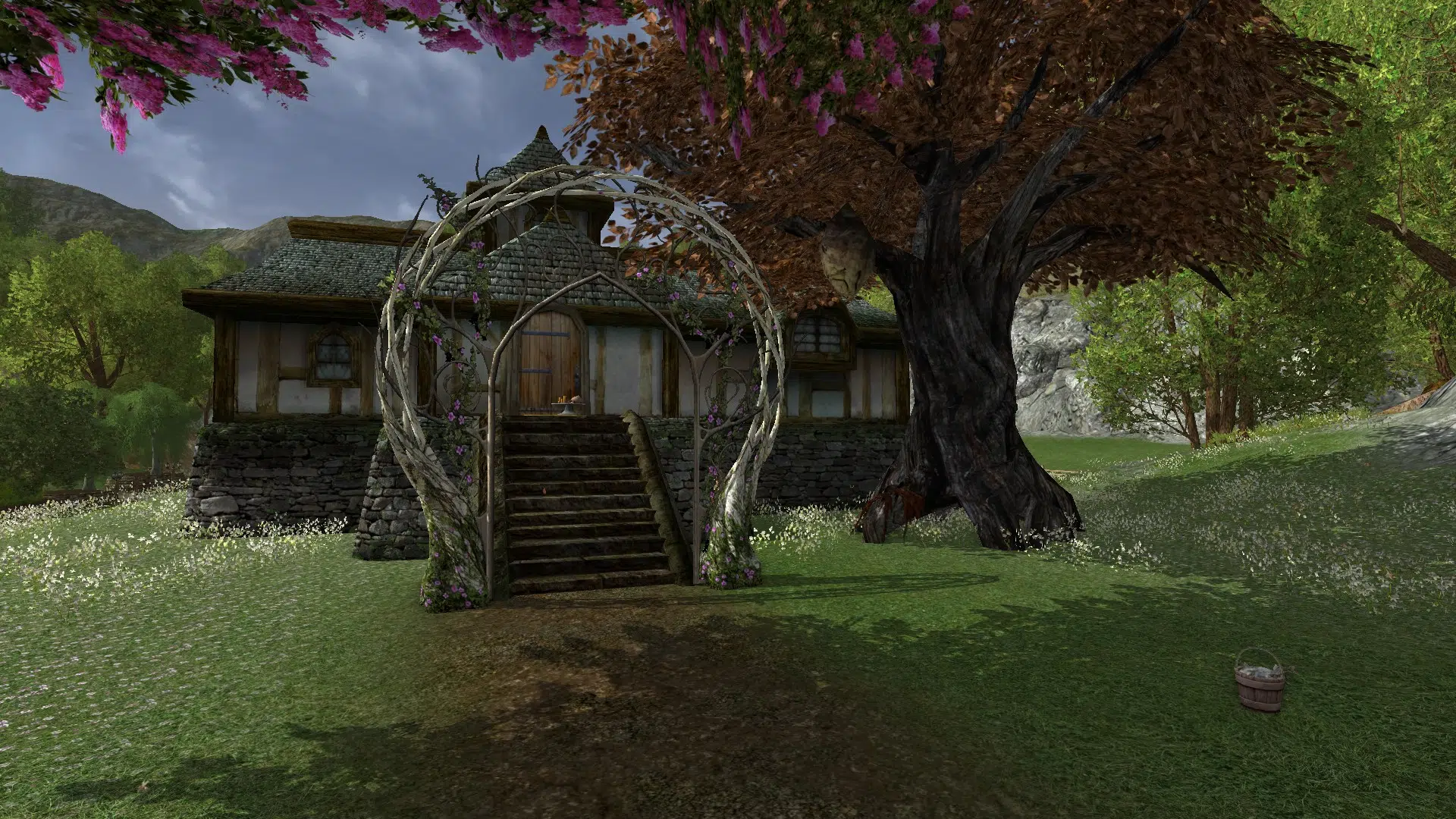 I really liked your yard and home. The arch at the foot of the steps, the lovely pink tree, everything. Your home feels lived in. Nice groupings of associated items, and the bunk beds with the ladder made creating a character on your server worth it. Great idea! I will have to experiment with the different beds to find good combinations. Thank you very much for the ideas, and for opening your home to me. 🙂