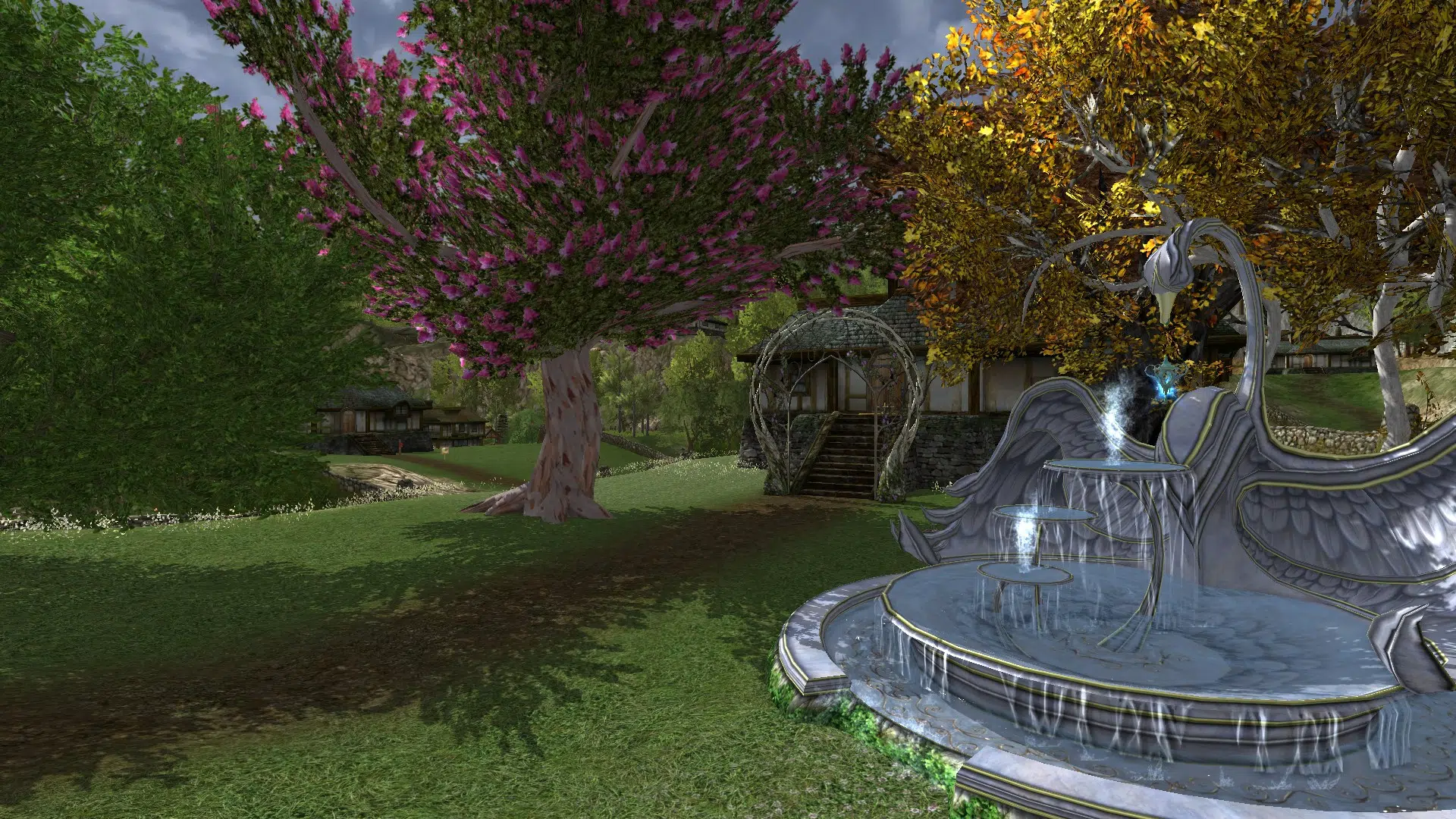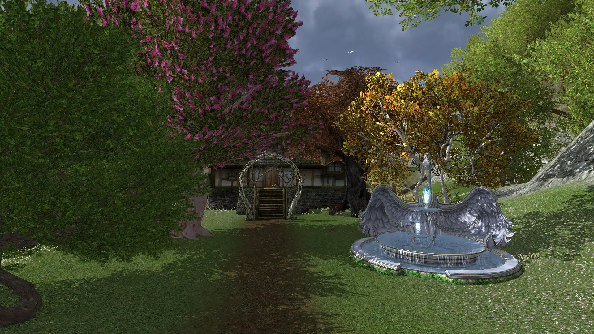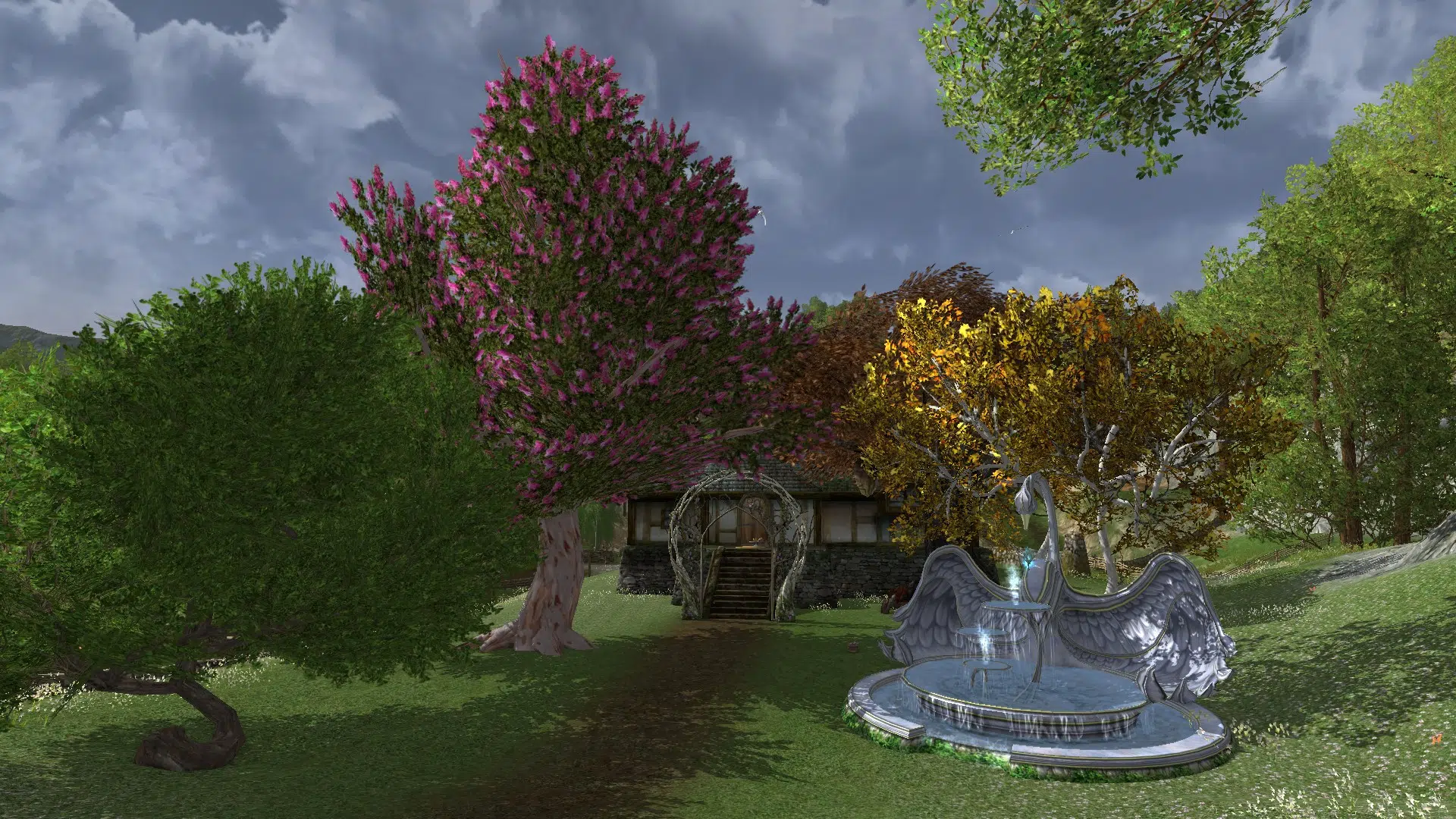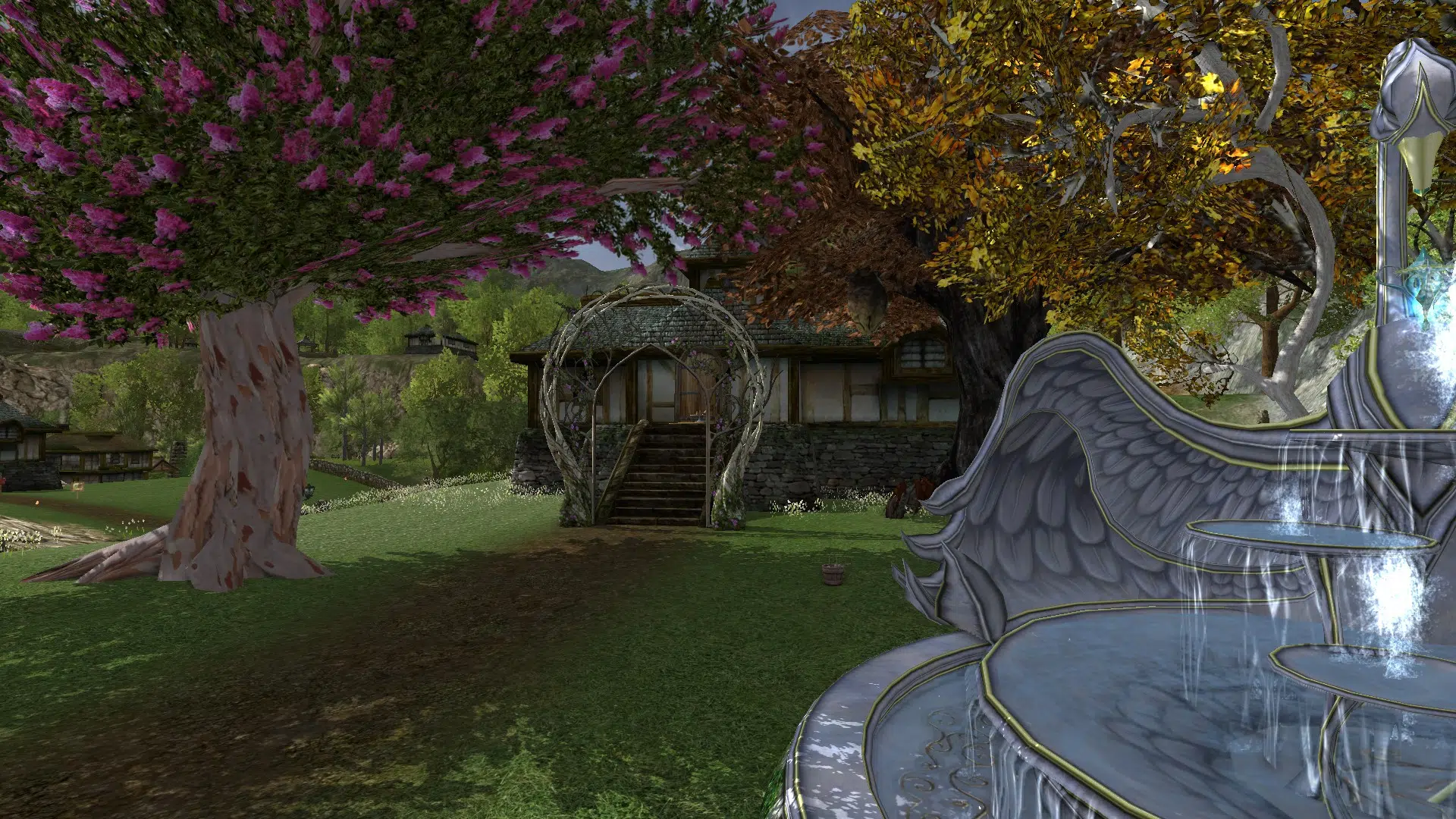 I really liked your yard and home. The arch at the foot of the steps, the lovely pink tree, everything. Your home feels lived in. Nice groupings of associated items, and the bunk beds with the ladder made creating a character on your server worth it. Great idea! I will have to experiment with the different beds to find good combinations. Thank you very much for the ideas, and for opening your home to me. 🙂