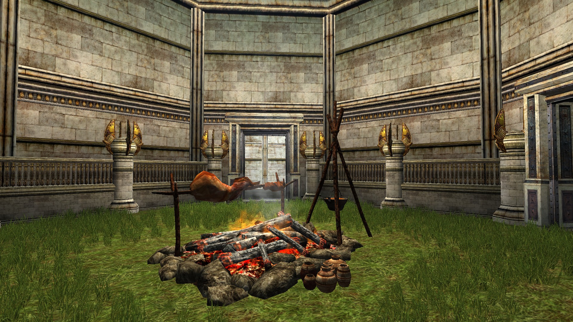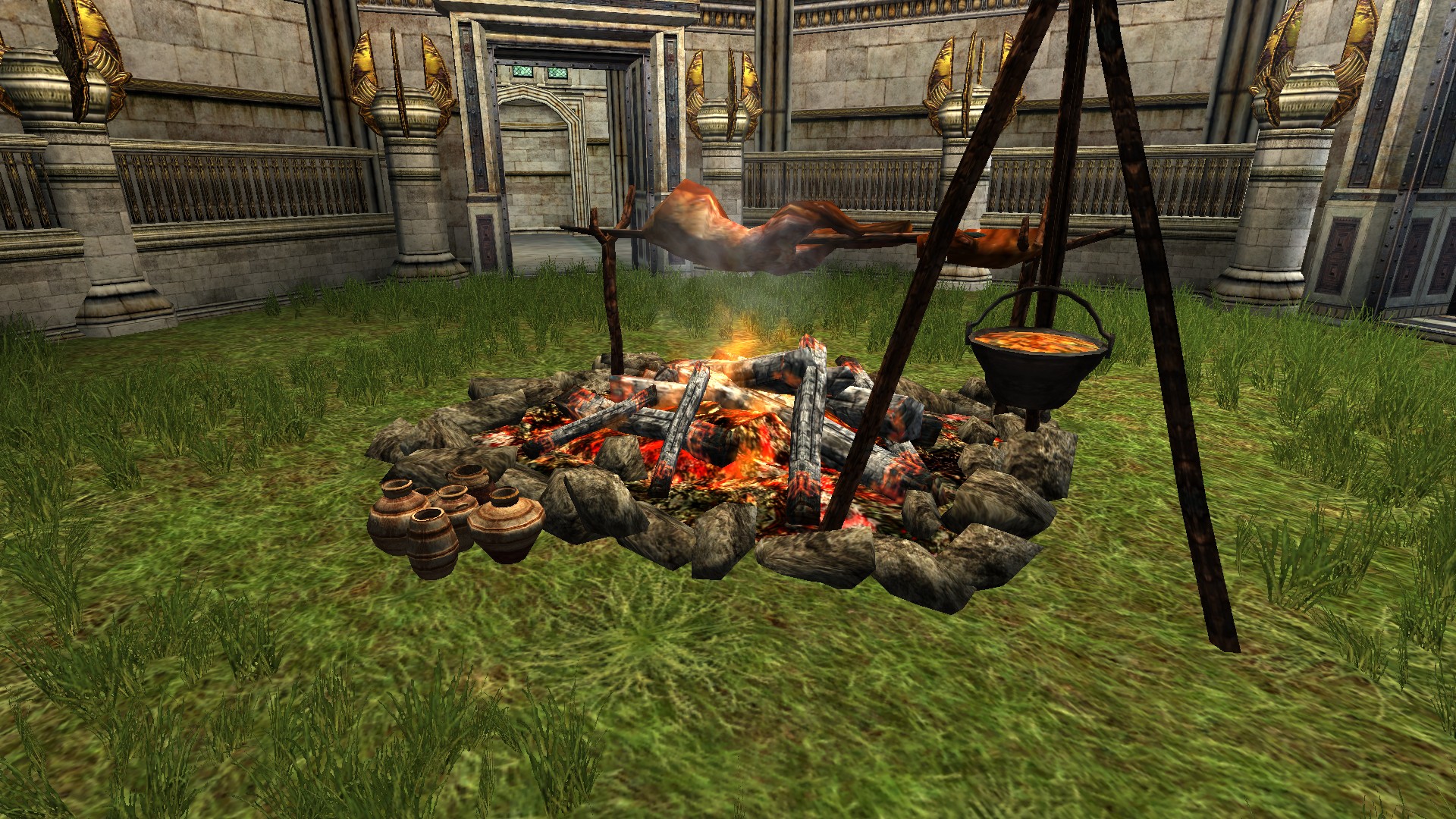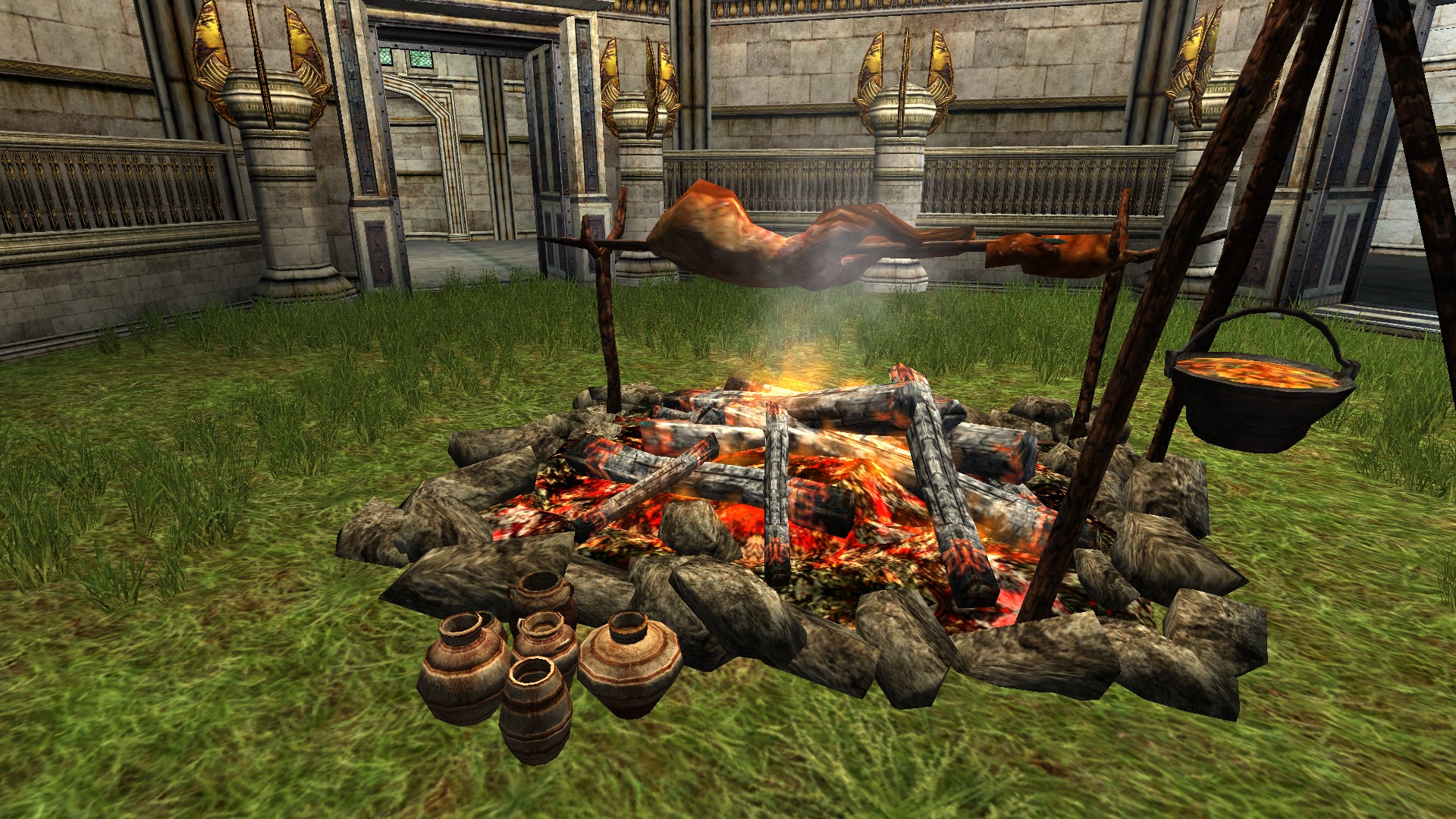 "A large cookfire with a rack of meat roasting on a spit and a pot of stew hanging from a stand."