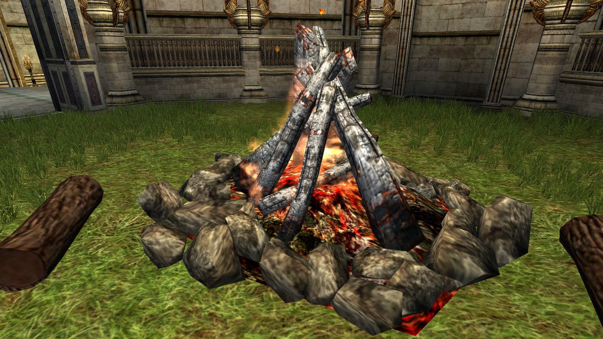 "A warm glowing bonfire in a fire-ring with log seating."