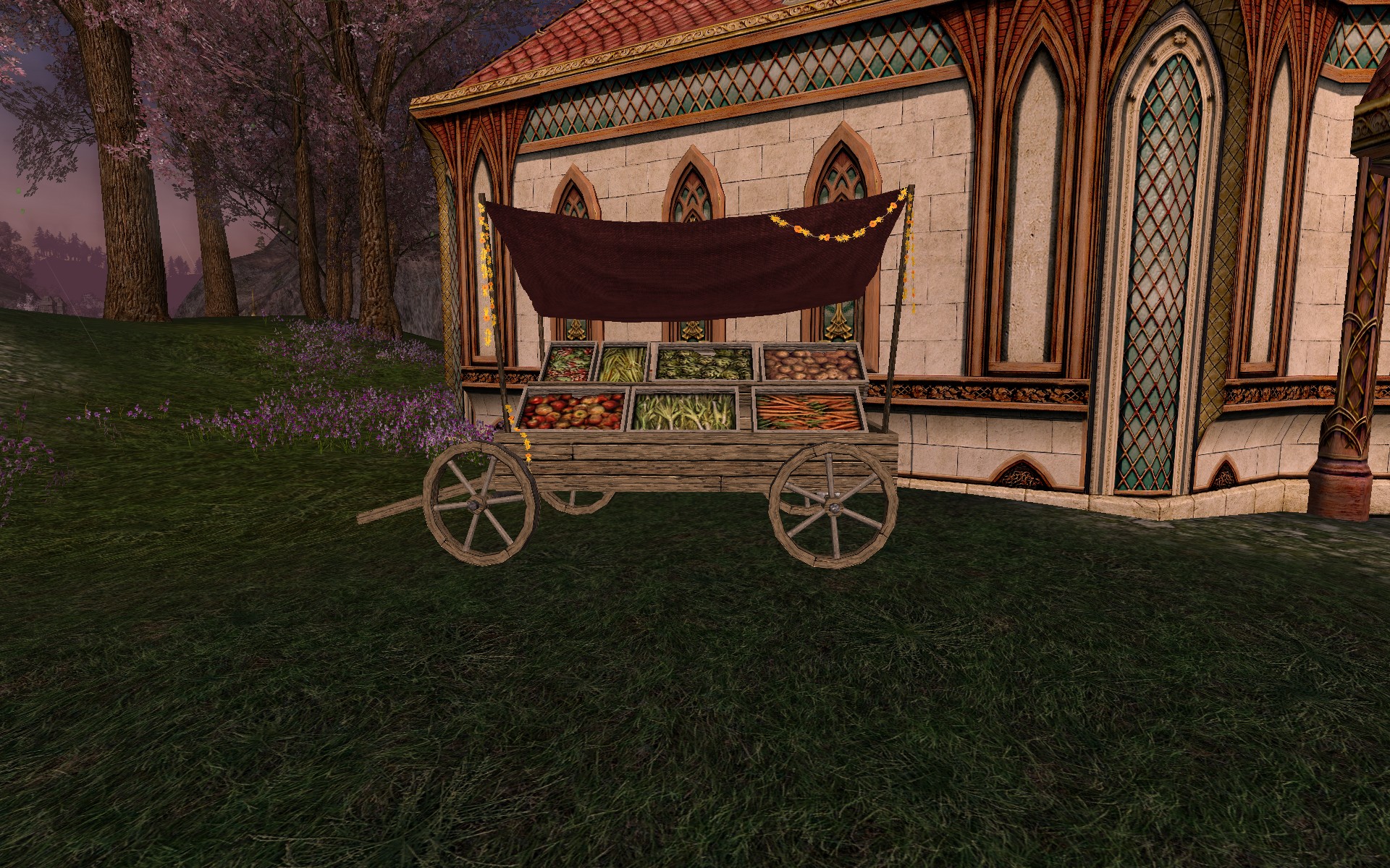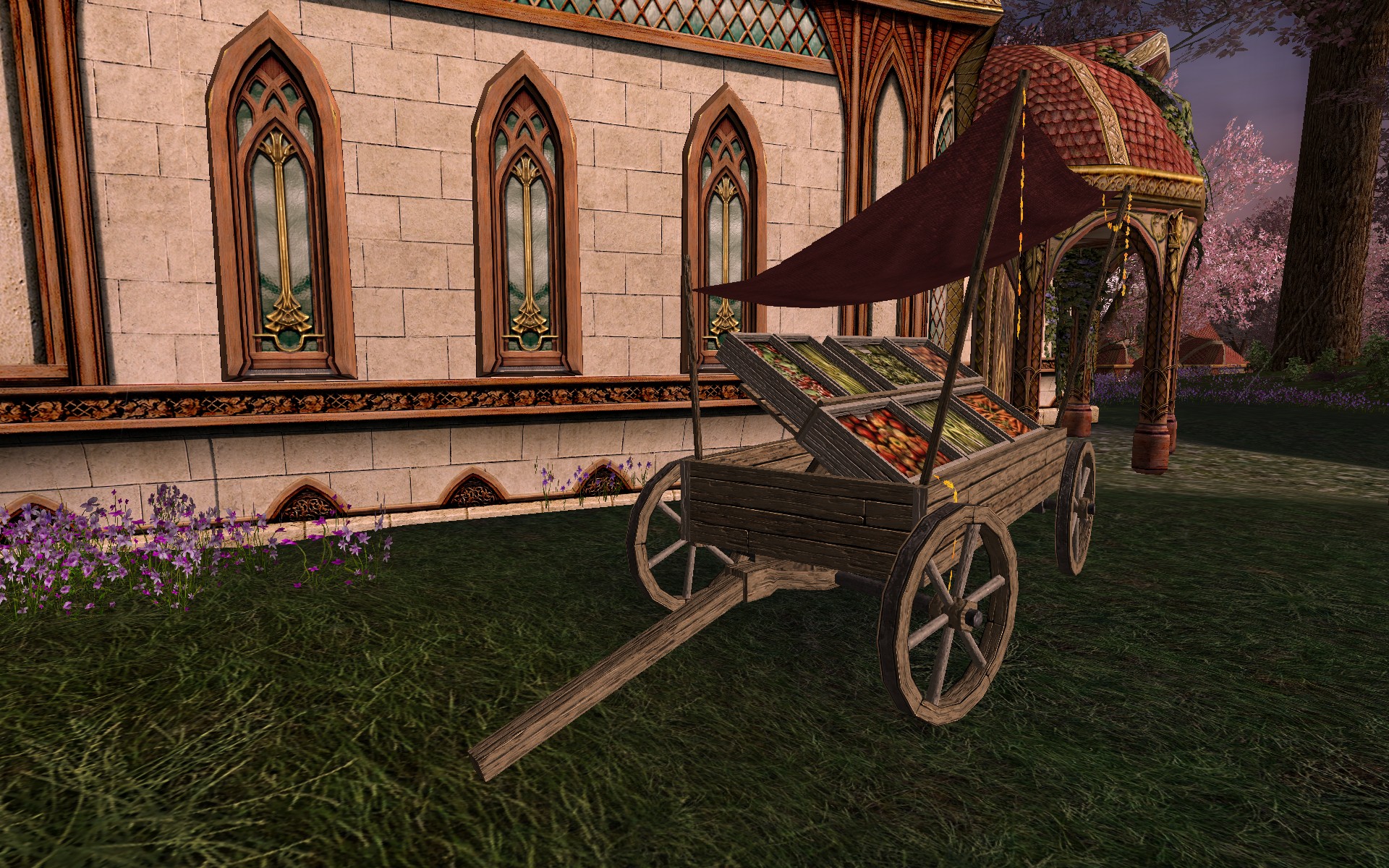 "A stand of fresh produce displayed in a wooden cart with a decorative awning."