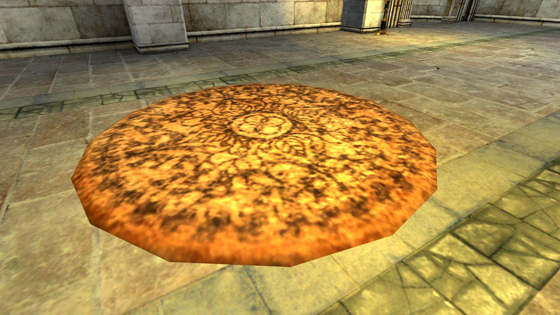 "A small Elven circular rug with a ring and leaf pattern."