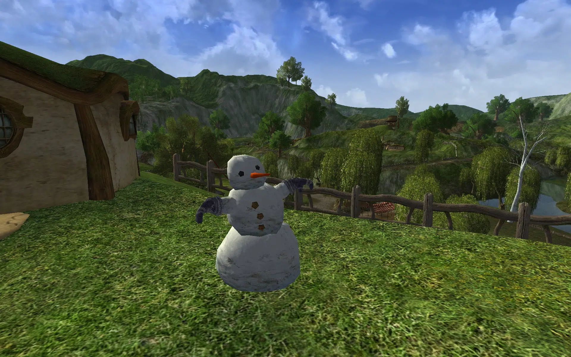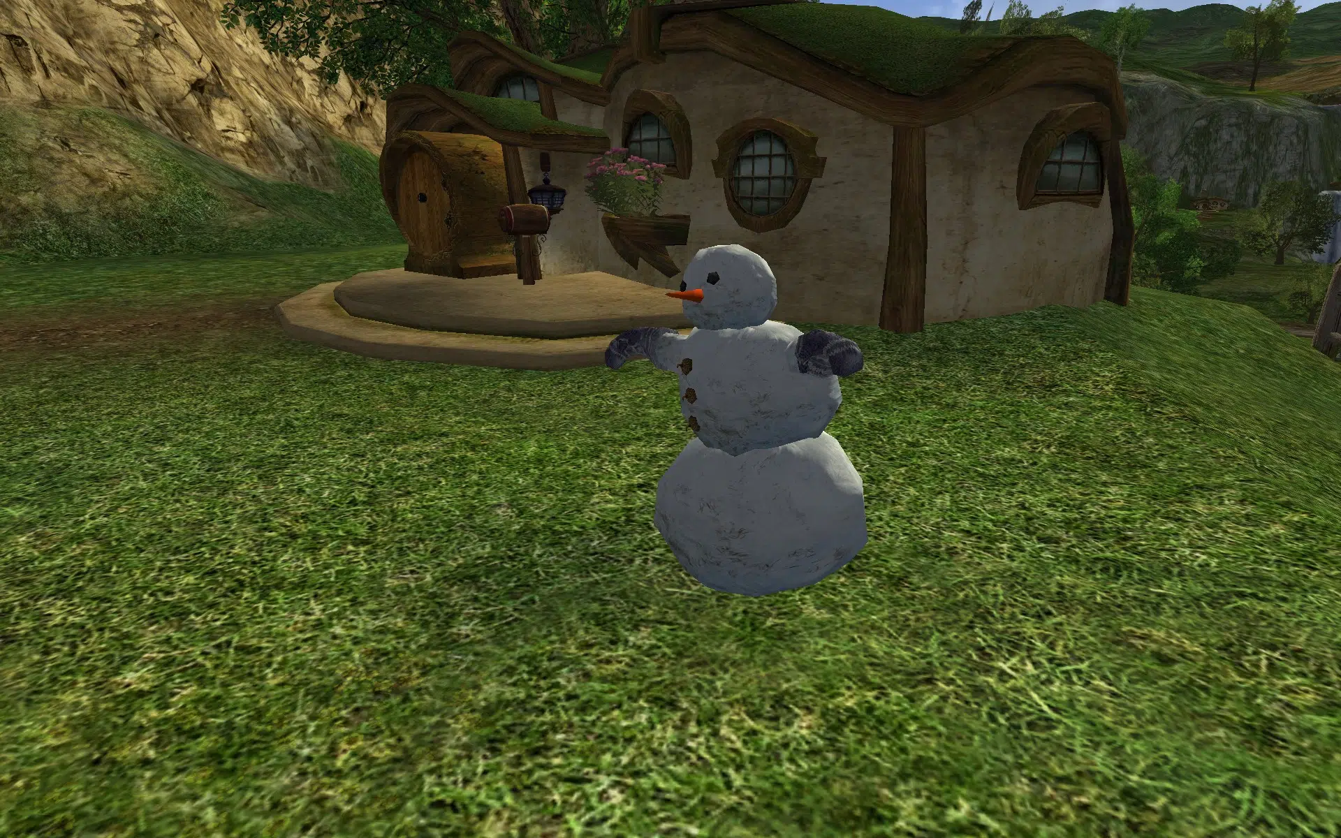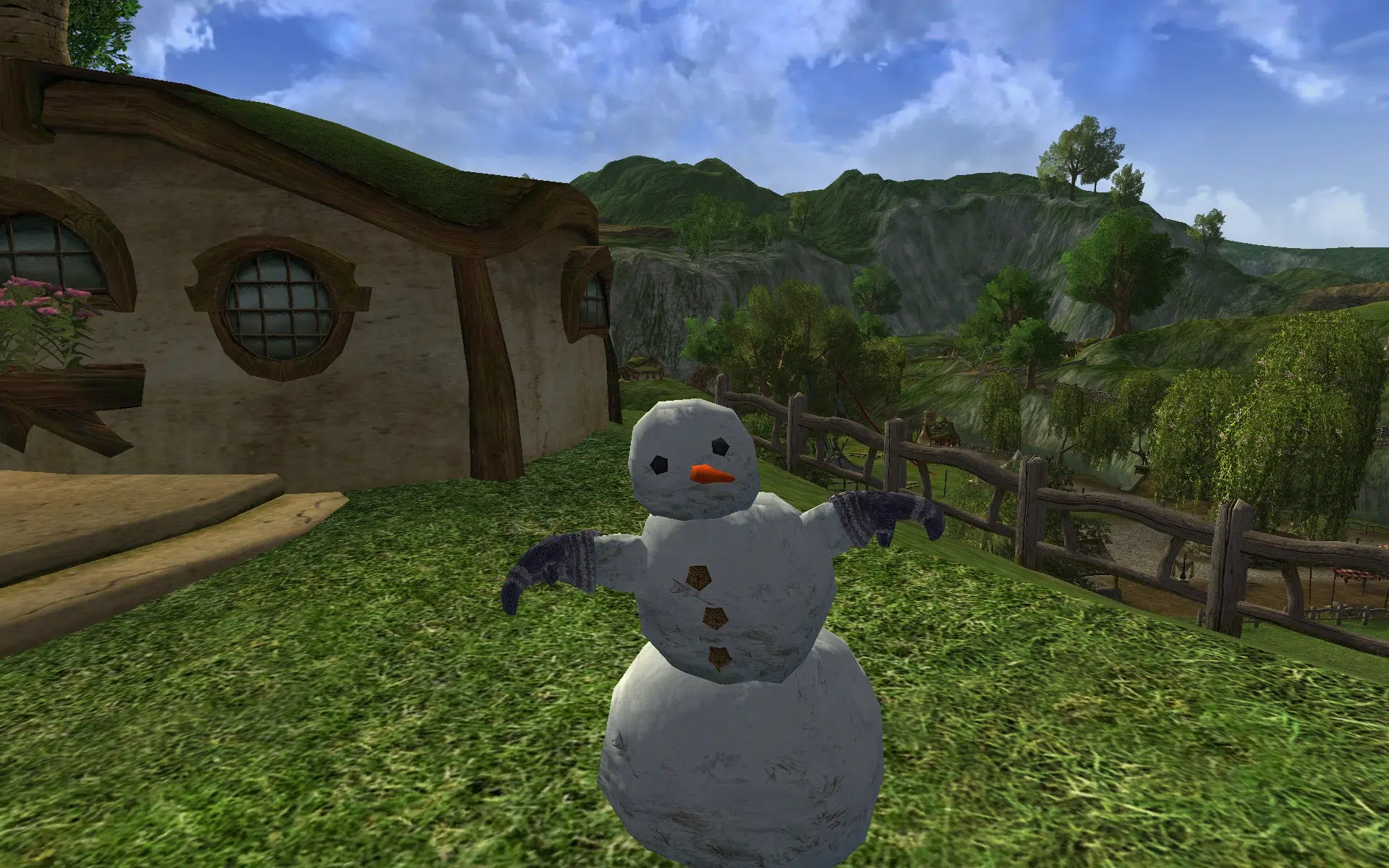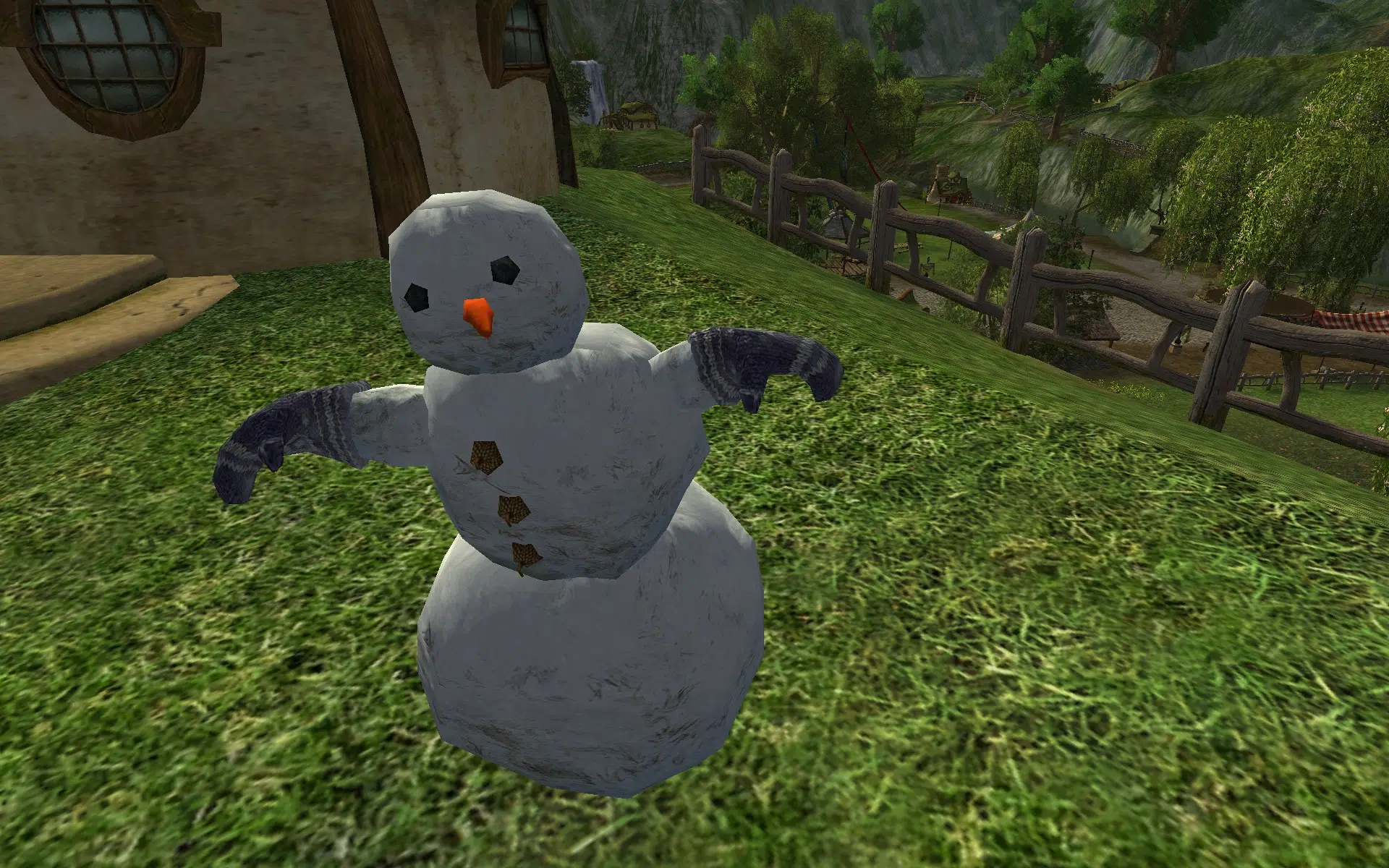 "A snowman with warm, fluffy mittens."