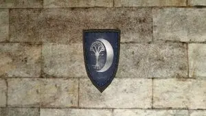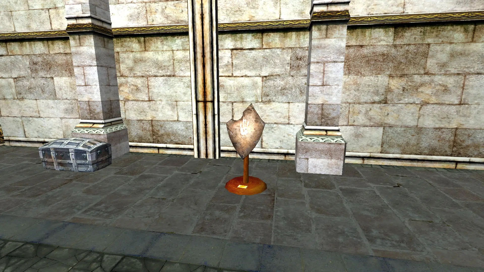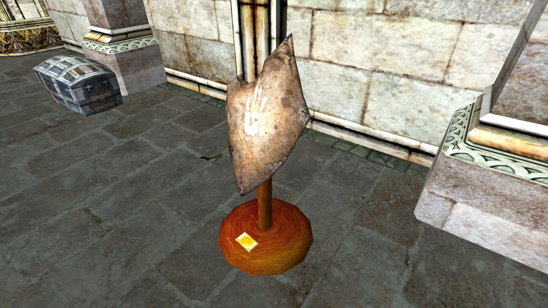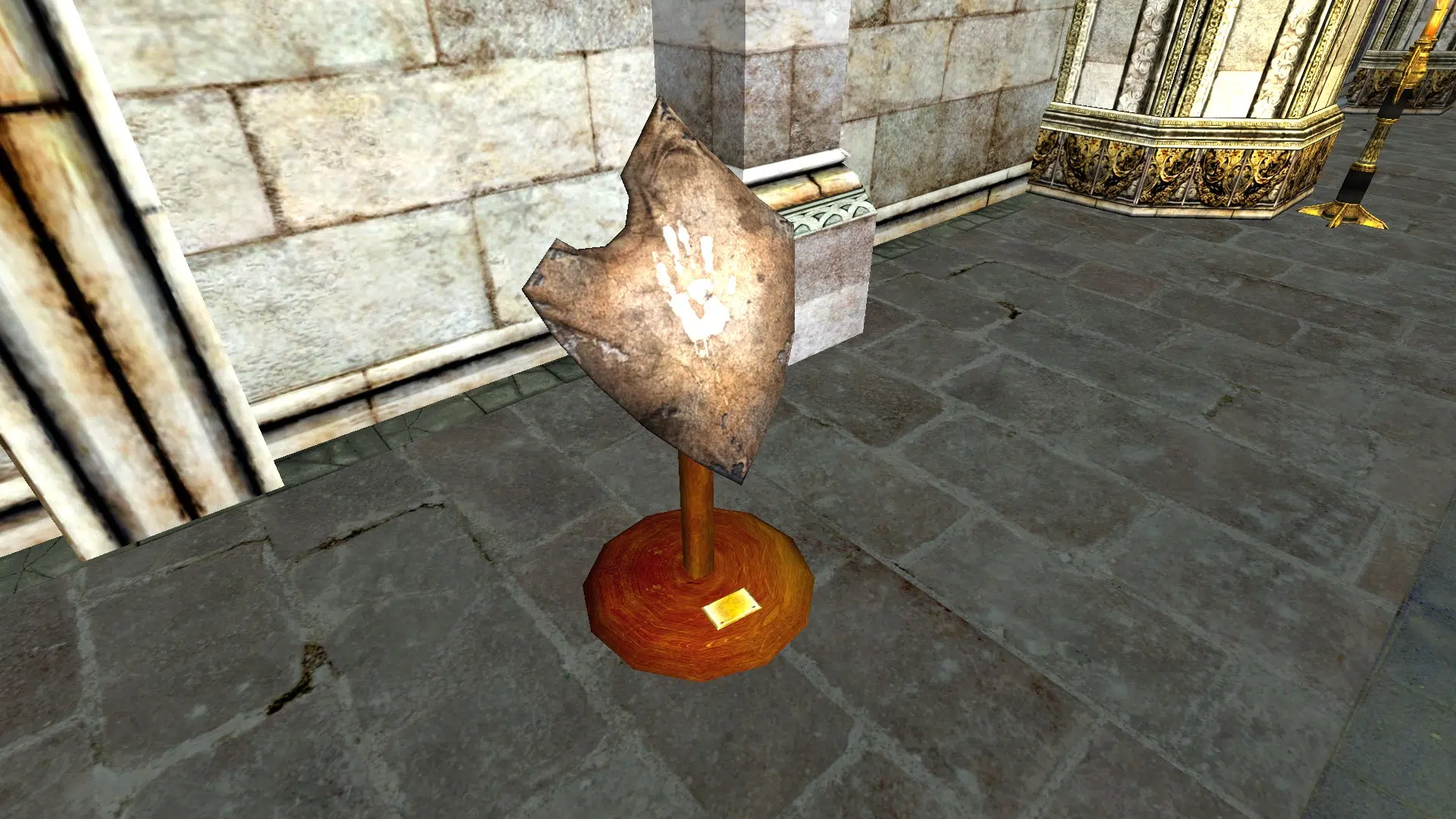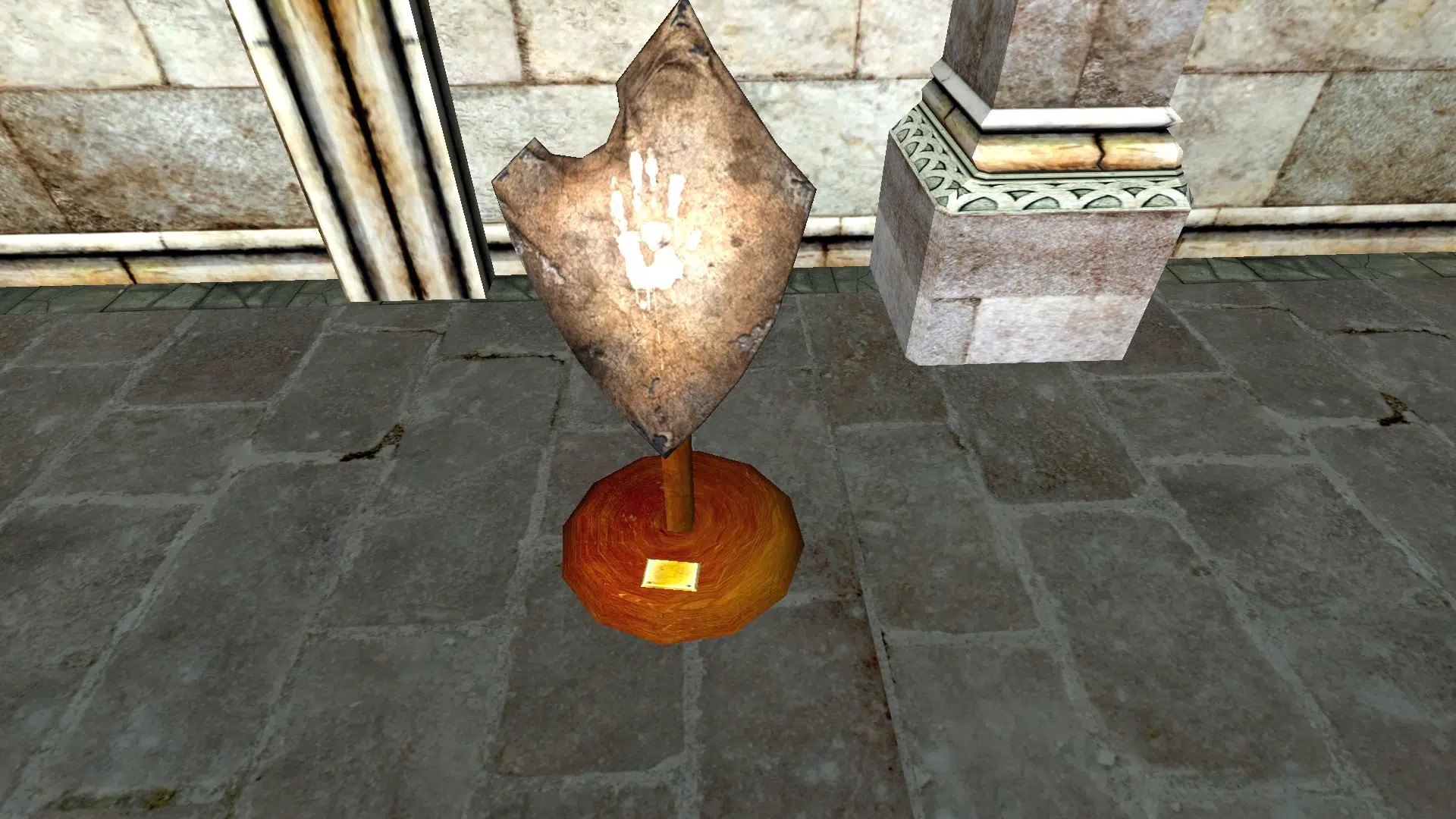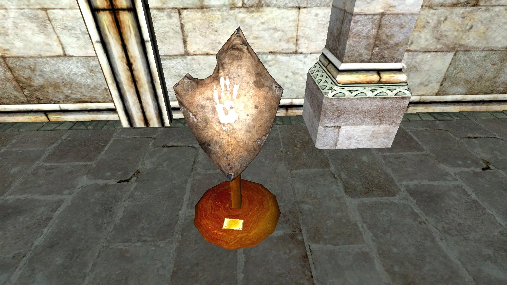 "A White Hand shield mounted on a stand."