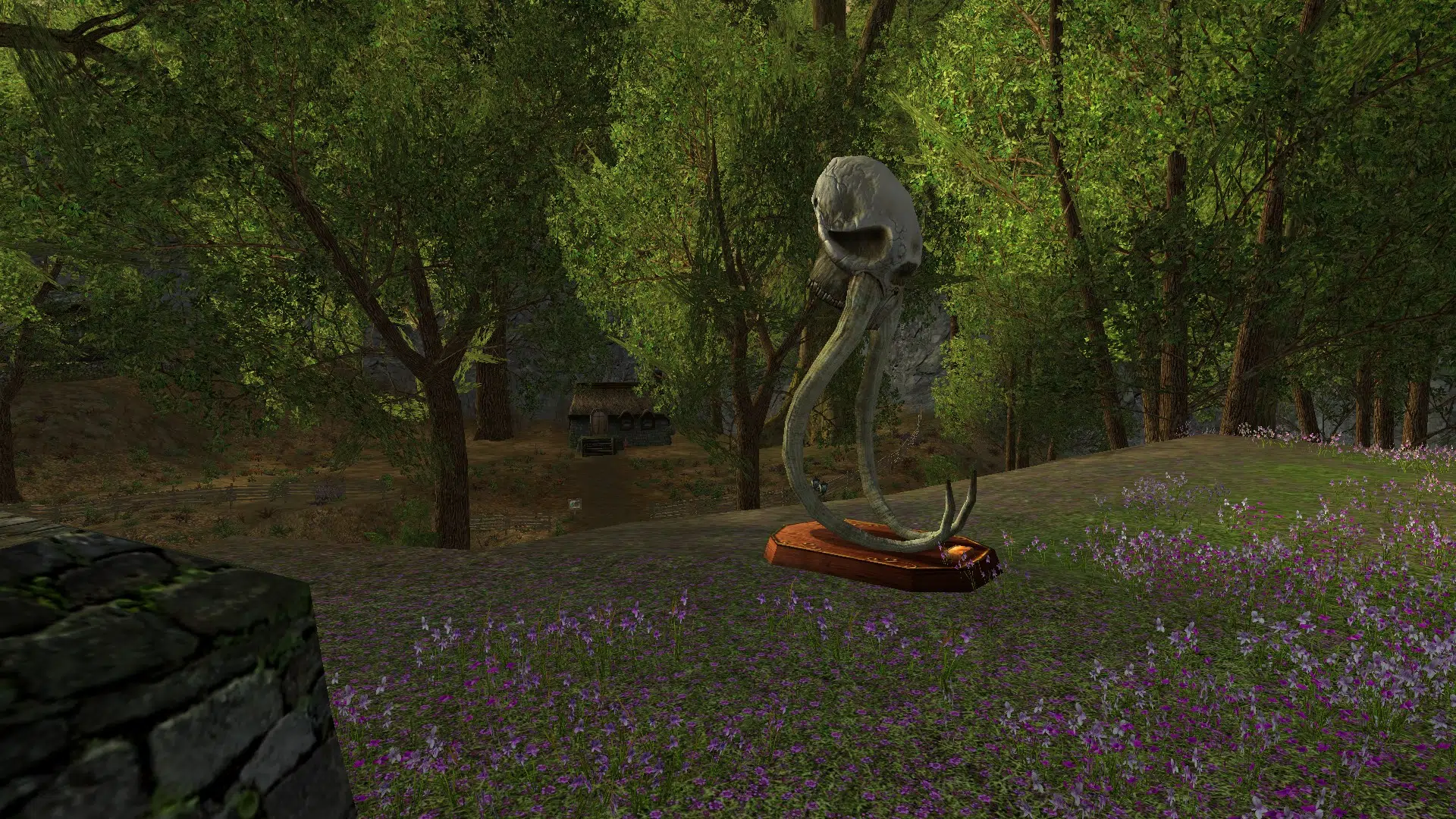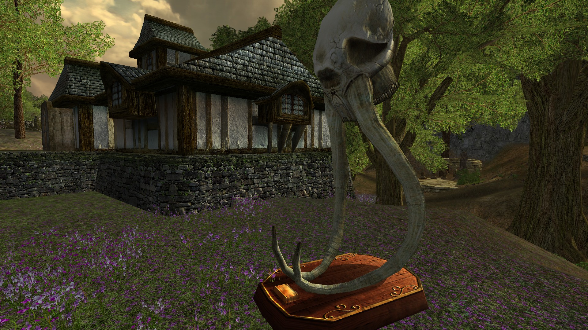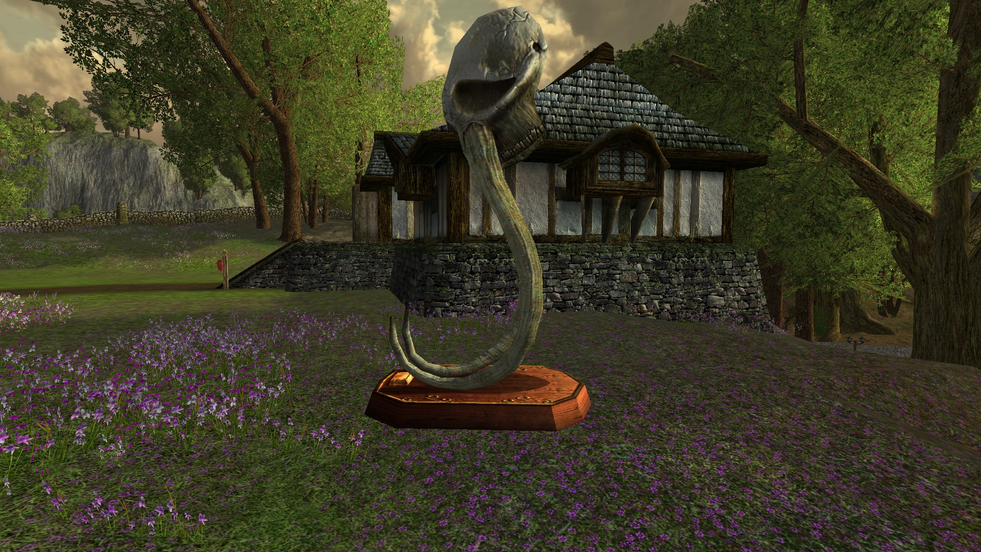 "The skull and tusks of a Forochel mammoth on a stand, expertly mounted, preserved, and posed by a taxidermist."