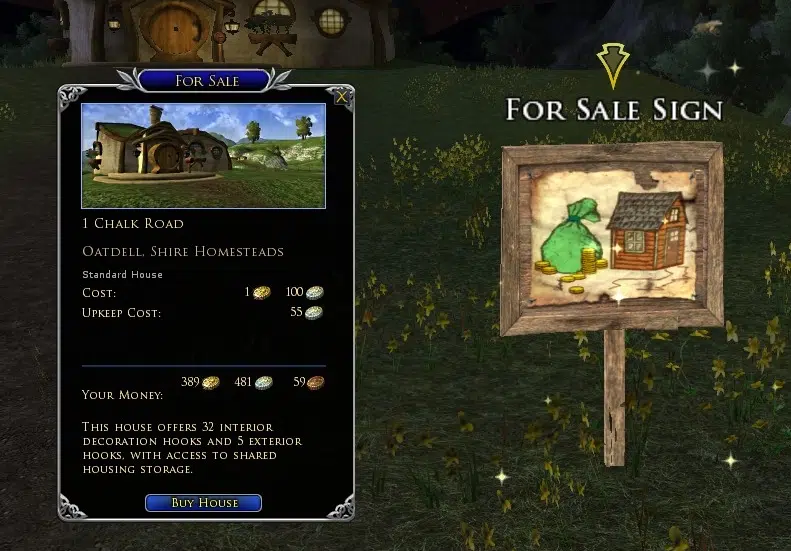 - Direct purchase: if the chosen house is available, you will see a sign planted in the garden. Click on it and you can buy your house if you meet the requirements.